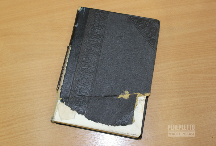Заменили старый переплет на новый в коже с тиснением